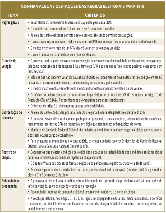 Critérios – A Resolução CFM nº 2.161/17 traz ainda regramentos gerais, como número de titulares e suplentes a serem eleitos para cada CRM (20 titulares e 20 suplentes por estado) e duração do mandato (cinco anos).