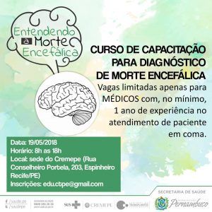 O Conselho Regional de Medicina de Pernambuco (Cremepe) em parceria com a Central de Transplante (CT-PE) realizará o curso de capacitação para diagnóstico da morte encefálica. Serão abordados os conceitos de morte encefálica, metodologia de determinação desse tipo de óbito e discussão prática de casos. Também serão trabalhados os fundamentos éticos e legais da determinação da morte encefálica e as condutas pós-determinação (comunicação da morte encefálica aos familiares e retirada do suporte vital). O curso é destinado à médicos que tenham pelo menos um ano de experiência em acompanhamento de pacientes em coma e será realizado no dia 19 de maio na sede do Cremepe, no Espinheiro. As inscrições são através do email edu.ctpe@gmail.com