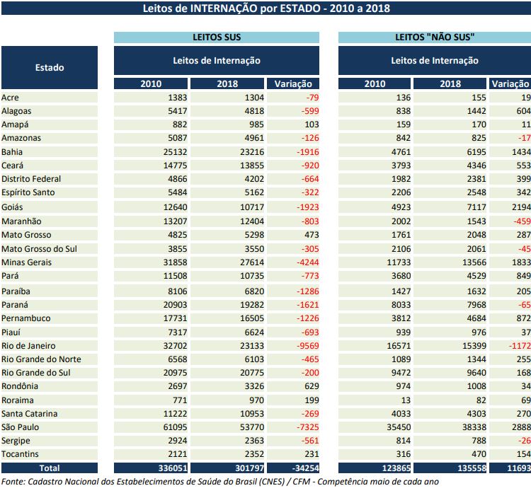 Os números apurados pelo Conselho Federal de Medicina (CFM) mostram que 22 estados e 18 capitais brasileiras perderam leitos nos últimos oito anos. Só no estado do Rio de Janeiro, por exemplo, 9.569 mil leitos foram desativados desde 2010, em Pernambuco a redução foi de 1226 leitos de internação. Na sequência, aparece São Paulo (-7.325 leitos) e Minas Gerais (-4.244). Na outra ponta, apenas cinco estados apresentaram evolução positiva no cálculo final de leitos SUS: Rondônia (629), Mato Grosso (473), Tocantins (231), Roraima (199) e Amapá (103).