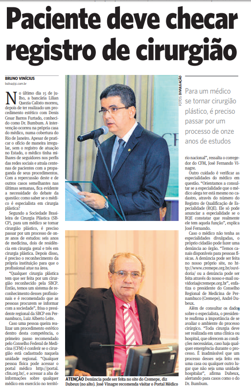 Além de consultar os dados sobre o especialista, o presidente reafirma a importância de se avaliar o ambiente do processo cirúrgico. “Toda cirurgia deve ser realizada em uma clínica ou hospital, que oferecem as condições necessárias, caso haja qualquer emergência durante o processo. É inadmissível que um processo desses seja feito em uma casa ou qualquer outro lugar que não seja uma unidade hospitalar”, afirma Dubeux, alertando para casos como o do Dr. Bumbum.
