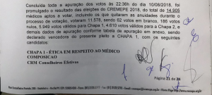 O Conselho Regional de Medicina de Pernambuco (Cremepe) informa que a Chapa 1 – ÉTICA EM RESPEITO AO MÉDICO – venceu as eleições do CREMEPE para a gestão 2018-2023, com 55% dos votos válidos (5949 votos) contra a Chapa 2 – MUDAR E AGIR que obteve 4610 votos. O mandato dos membros – 20 titulares e 20 suplentes – tem início no dia 1º de outubro deste ano. A Eleição em Pernambuco foi mista, (presencial e por correspondência) nos dias 7 e 8 de agosto, com urnas na sede, delegacias e diversos hospitais da capital e interior do estado. Os médicos que não votaram devem encaminhar sua justificativa de ausência ao Conselho em até 60 dias.