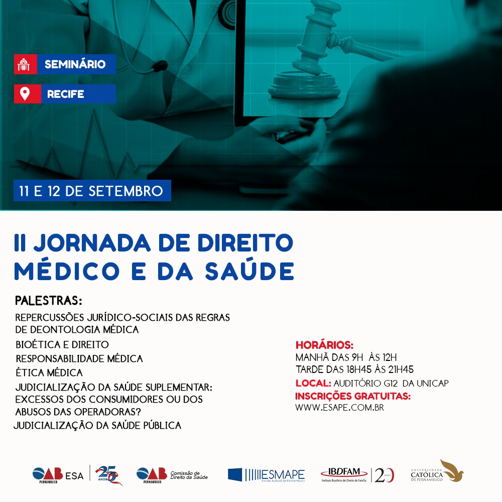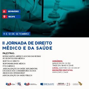 Promoção: Universidade Católica de Pernambuco – Unicap, Escola Superior da Advocacia – ESA/PE, Escola Judicial de Pernambuco – ESMAPE, Comissão de Direito e Saúde – CDS da OAB/PE, IBDFAM/PE e Grupo de Pesquisa Direito Civil e Ação da UNICAP.