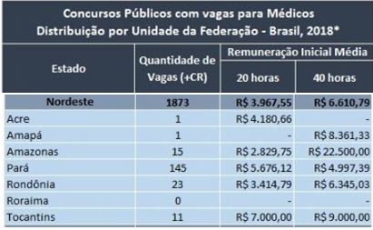 Levantamento feito pelo Conselho Federal de Medicina (CFM) sobre concursos públicos para contratar médicos indica que, em média, o valor oferecido por prefeituras representa menos da metade do que é referenciado pelas representações sindicais da categoria. Atualmente, o piso pleiteado é de R$ 14.134,58 para 20 horas semanais de trabalho. Segundo os editais lançados no primeiro semestre de 2018, no entanto, a média de salários oferecidos foi de R$ 5.520,73 para essa jornada.Entre os 441 concursos analisados, que totalizam pouco mais de cinco mil vagas (incluindo a de cadastro-reserva), somente quatro oferecem salários cujo valor por hora supera o piso nacional – dois no Paraná, um em Minas Gerais e um no Amazonas. Quando se avalia a remuneração inicial média por estado, no entanto, nenhum deles alcança o piso sugerido pela categoria.