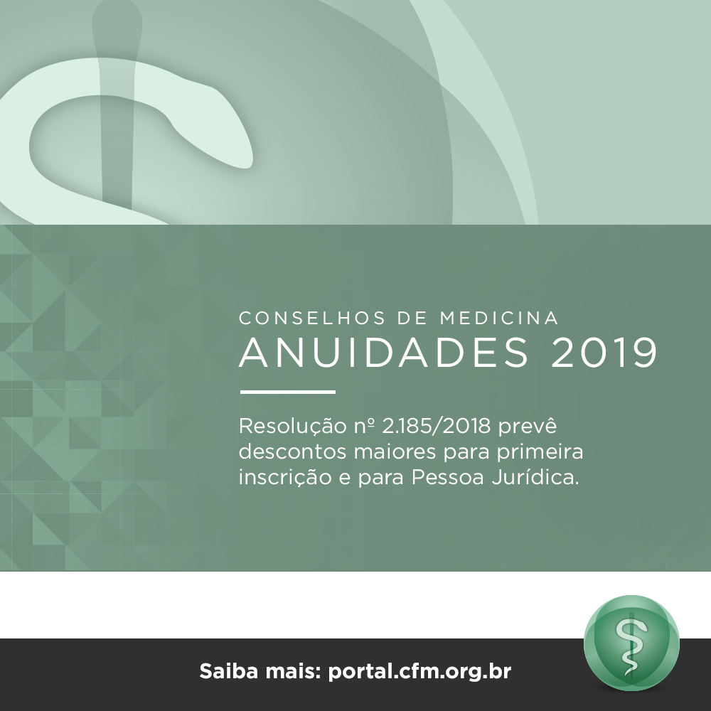 Foi publicada no Diário Oficial da União no dia 30 de agosto a Resolução CFM nº 2.185/2018, que fixa os valores das anuidades para o exercício de 2019 e trata de outros temas relacionados como a cobrança de anuidades de exercícios anteriores e valores das taxas de serviços. Entre as novidades, estão descontos maiores para a primeira inscrição do médico e para pessoas jurídicas enquadradas na primeira faixa de capital social que cumpram alguns requisitos enumerados na norma. Os médicos que não receberam o boleto da anuidade 2019 podem baixá-lo pelo site do Cremepe. Acesse: http://www.cremepe.org.br/2a-via-do-boleto-da-anuidade/