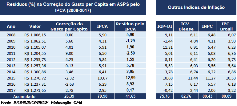 No período de 2008 a 2017, o que a gestão pública – em suas três esferas – dispensou com a conta da saúde por habitante no País não teve reajustes que superassem os valores de reposição previstos no Índice de Preços ao Consumidor Amplo (IPCA), o principal indicador da inflação no Brasil e que, no período, subiu cerca de 80%. Mesmo tendo ganhos médios de 3% ano, nesse intervalo de dez anos, resultando em um acumulado de 26%, a perda do gasto per capita comparado ao medidor inflacionário chega a quase 42%.
