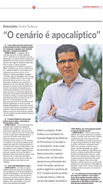 ANDRÉ DUBEUX – Nunca fui contra o Mais Médicos. Não concordo, assim como as entidades médicas, com médicos que não tiveram o diploma revalidado. Mas não vamos entrar mais nesse mérito. O Mais Médicos, do ponto de vista de levar os colegas a lugares distantes, foi válido. Pensar, no entanto, em resolver o problema da saúde pública com a presença de médico é querer pensar, com toda honestidade, que a gente é idiota. Isso é tão verdade que o Mais Médicos não resolveu o problema da saúde pública no Brasil. No Recife, que tinha médicos cubanos, a saúde pública é uma vergonha: falta material, e estava na pauta a questão remuneratória. Mas a pauta principal é a segurança. Para se fazer visita domiciliar, o médico precisava ter o aval do poder paralelo, que é o dos traficantes. O Mais Médicos é importante. Se não houver, contudo, mudanças de paradigma, de fluxo e de gestão, continuará sem resolutividade.