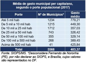 Cerca de 2.800 municípios brasileiros gastaram menos de R$ 403,37 na saúde de cada habitante durante todo o ano de 2017. Segundo a análise do Conselho Federal de Medicina (CFM) sobre as contas da saúde, esse foi o valor médio aplicado pelos gestores municipais com recursos próprios em Ações e Serviços Públicos de Saúde (ASPS), declaradas no Sistema de Informações sobre os Orçamentos Públicos em Saúde (Siops), do Ministério da Saúde.