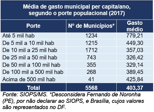Segundo a análise do CFM, em média, as 5.568 cidades brasileiras que prestaram contas sobre suas despesas ao Ministério da Saúde investiram, no ano passado, R$ 403,37 na saúde de cada habitante. No entanto, no grupo de municípios que prestou informações pelo Siops em 2017 e que estavam aptos a receber participantes do PMM em seu 16º ciclo do PMM (aberto em novembro) a média do gasto per capita ficou em R$ 396,38 por pessoa. Considerando que esse gasto é por cada habitante, o montante é elevado quando multiplicado pelo tamanho da população.