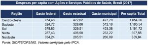 O levantamento mostra, por exemplo, que os municípios menores (em termos populacionais) arcam proporcionalmente com uma despesa per capita maior. Em 2017, nas cidades com menos de cinco mil habitantes, as prefeituras gastaram em média R$ 779,21 na saúde de cada cidadão – quase o dobro da média nacional identificada. Além disso, os municípios das regiões Sul e Sudeste foram os que apresentaram uma maior participação no financiamento do gasto público em saúde, consequência, principalmente, de sua maior capacidade de arrecadação.