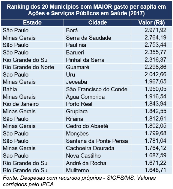Ranking nacional – Entre os mais altos valores per capita naquele ano, estão os das duas menores cidades do País. Com apenas 839 habitantes, Borá (SP) lidera o ranking municipal, tendo aplicado R$ 2.971,92 para cada um dos 812 munícipes. Em segundo lugar, aparece Serra da Saudade (MG), cujas despesas em ações e serviços de saúde alcançaram R$ 2.764,19 por pessoa.