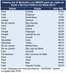 Na outra ponta, entre os que tiveram menor desempenho na aplicação de recursos, estão três cidades de médio e grande porte, todas situadas no estado do Pará: Cametá (R$ 67,54), Bragança (R$ 71,21) e Ananindeua (R$ 76,83).