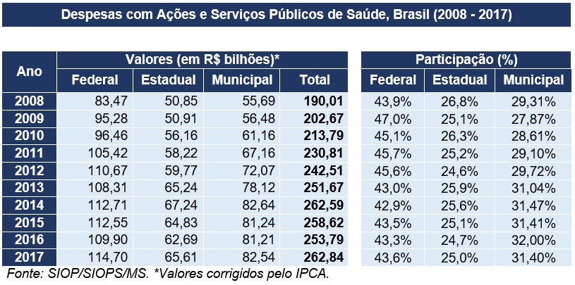 Em 2008, as prefeituras assumiam 29,3% do gasto público. Esse percentual em 2017 alcançou 31,4%. Já a União, que na década de 1990 chegou a ser responsável por 75% do financiamento da saúde no Brasil, praticamente se manteve próxima de 43% na última década. No caso dos estados, o índice teve pouca variação no período, oscilando entre 26,8% a 25% das despesas.