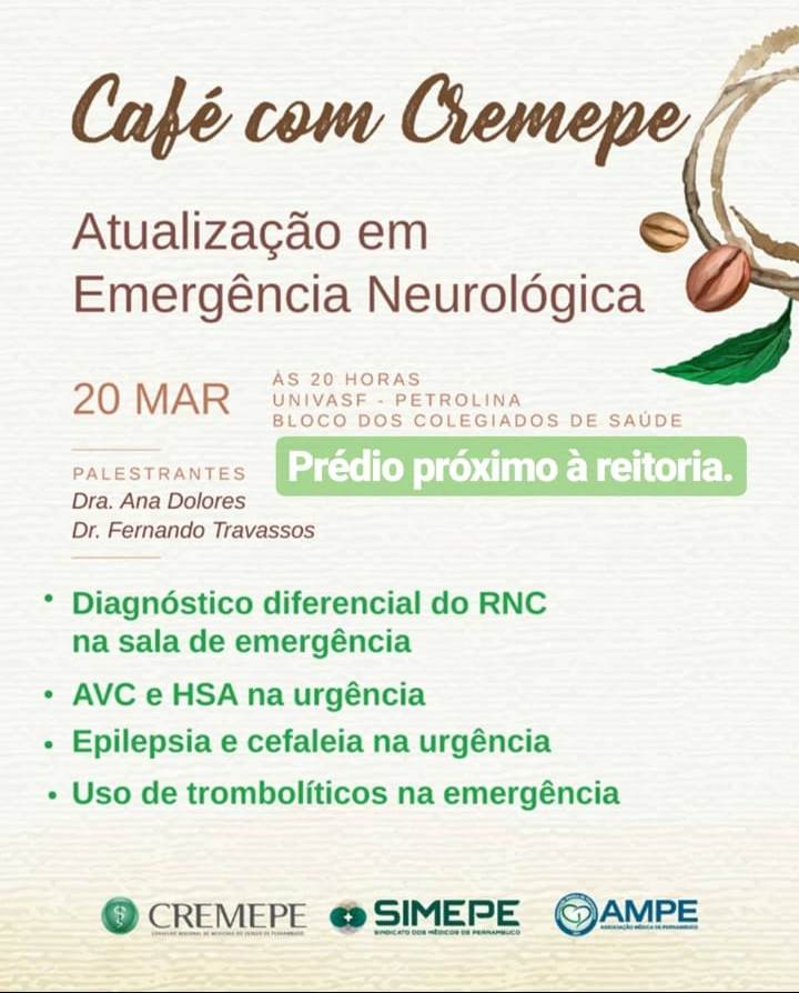 O Conselho Regional de Medicina de Pernambuco (Cremepe) promoverá na próxima quarta-feira (20/03) um curso de Atualização em emergência neurológica para médicos e profissionais de saúde. O curso será realizado a partir das 20h no auditório dos colegiados de saúde, na Univasf, em Petrolina. O evento tem o apoio do Sindicato dos Médicos e Associação Médica de Pernambuco.