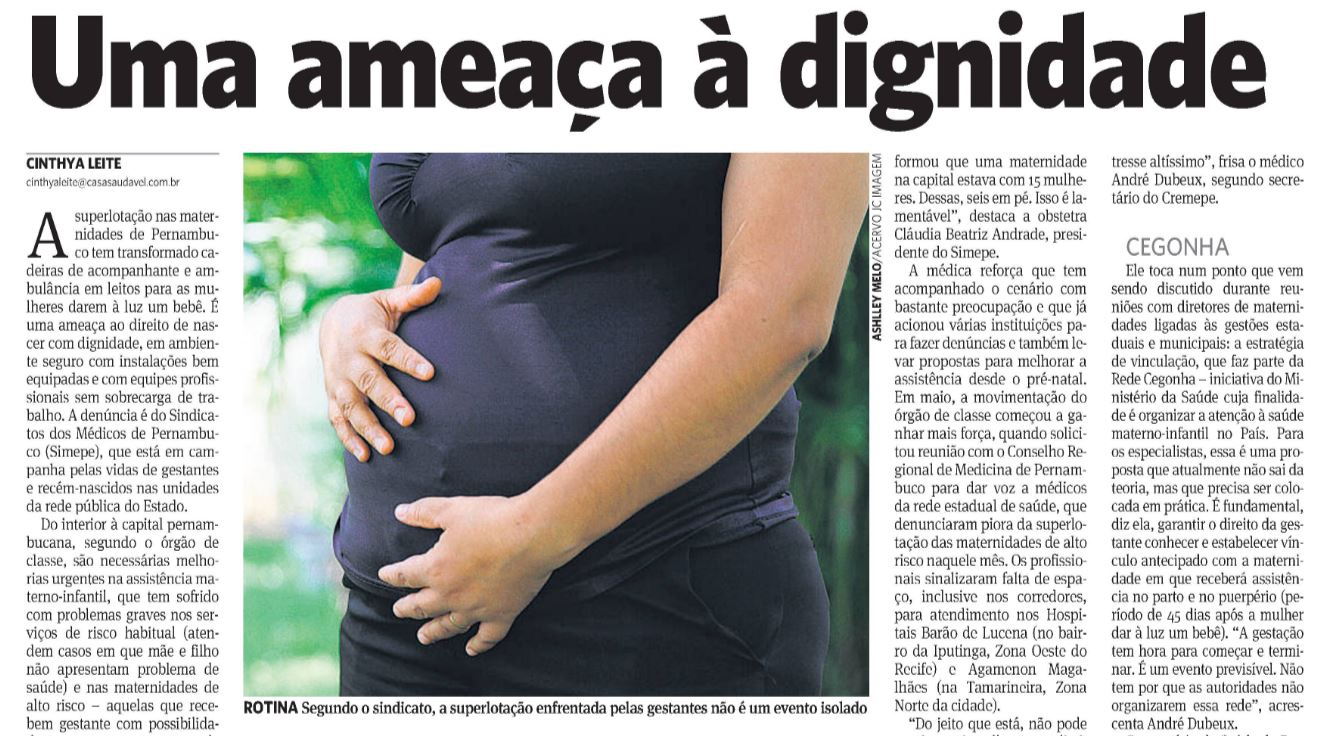 A superlotação nas maternidades de Pernambuco tem transformado cadeiras de acompanhante e ambulância em leitos para as mulheres darem à luz um bebê. É uma ameaça ao direito de nascer com dignidade, em ambiente seguro com instalações bem equipadas e com equipes profissionais sem sobrecarga de trabalho. A denúncia é do Sindicatos dos Médicos de Pernambuco (Simepe), que está em campanha pelas vidas de gestantes e recém-nascidos nas unidades da rede pública do Estado.