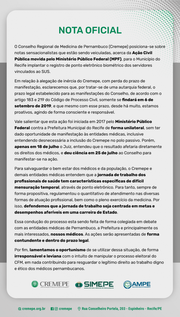 O Conselho Regional de Medicina de Pernambuco (Cremepe) posiciona-se sobre notas sensacionalistas que estão sendo veiculadas, acerca da Ação Civil Pública movida pelo Ministério Público Federal (MPF), para o Município do Recife implantar o registro de ponto eletrônico biométrico dos servidores vinculados ao SUS.