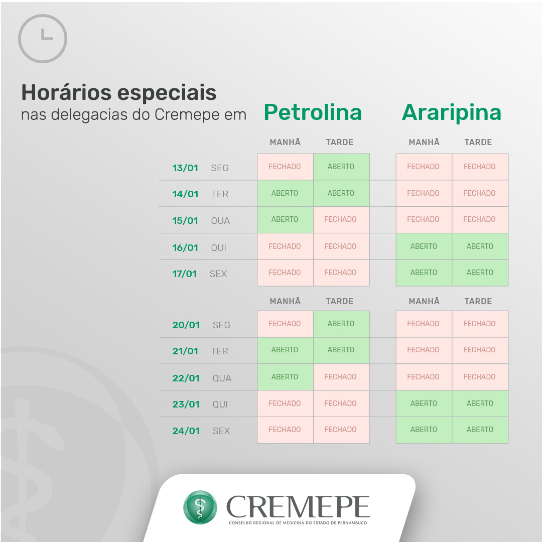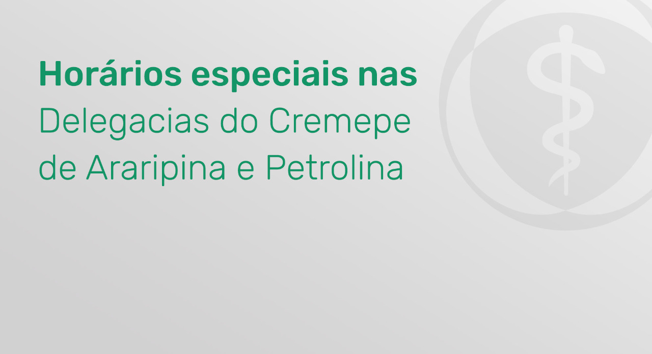 O Conselho Regional de Medicina de Pernambuco (Cremepe) informa que as delegacias do Conselho de Petrolina e Araripina terão atendimentos em horários especiais no mês de janeiro de 2020. Os atendimentos devem ser preferencialmente agendados através do portal do Cremepe para as delegacias ou sede do Conselho em Recife, localizada na avenida Conselheiro Portela, 203, Espinheiro- Recife.