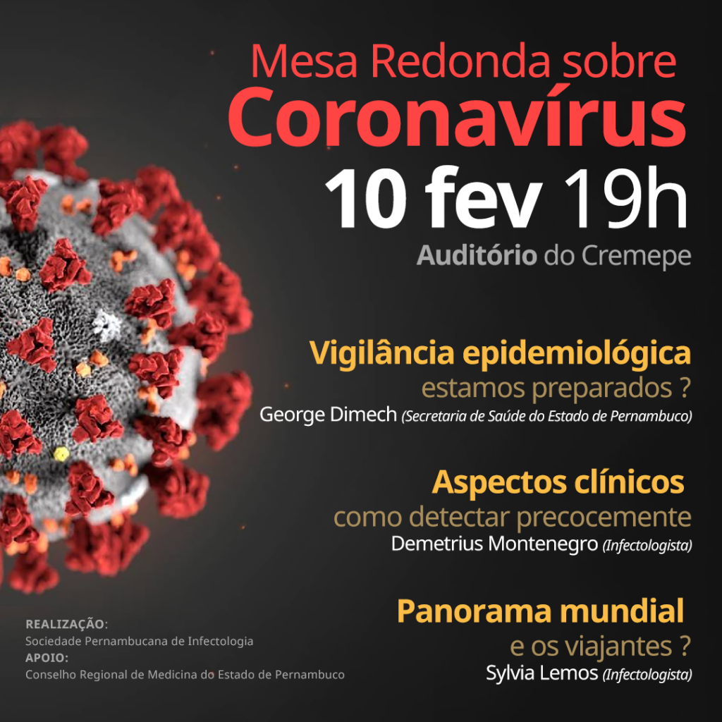Será realizada pela Sociedade Pernambucana de Infectologia, com apoio do Conselho Regional de Medicina do Estado de Pernambuco (Cremepe), uma Mesa Redonda sobre o Coronavírus na próxima segunda – feira (10), a partir das 19h. O evento acontecerá no auditório do Cremepe, localizado no bairro do Espinheiro, zona norte do Recife.