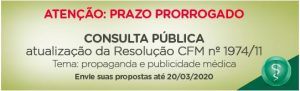 Com o objetivo de ampliar o debate sobre a atualização da Resolução nº 1.974/2011, que regulamenta a propaganda e a publicidade médica, o Conselho Federal de Medicina (CFM) ampliou o período para o envio de sugestões. Os médicos e entidades médicas, que tinham até o dia 1º de março para apresentar suas propostas, poderão fazer suas contribuições até o dia 20 de março.