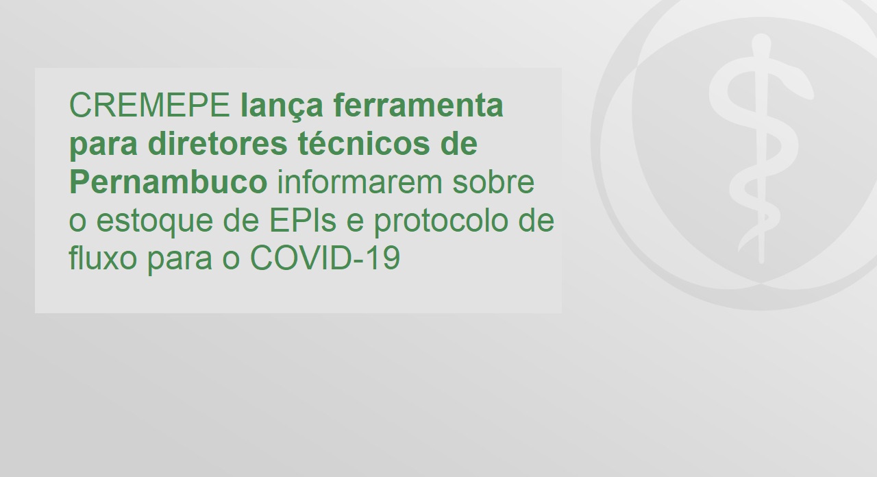 O Conselho Regional de Medicina de Pernambuco (Cremepe) disponibiliza a partir de hoje (20/03) a ferramenta, divulgada em coletiva de imprensa, para que os diretores técnicos ou médico designado possam informar sobre a disponibilidade dos Equipamentos de Proteção Individual (EPI) e protocolo de fluxo de atendimento ao COVID-19 nas unidades públicas e privadas de saúde do Estado. Eles devem informar através do link: www.cremepe.org.br/epicovid19 disponível no portal do Cremepe (www.cremepe.org.br).