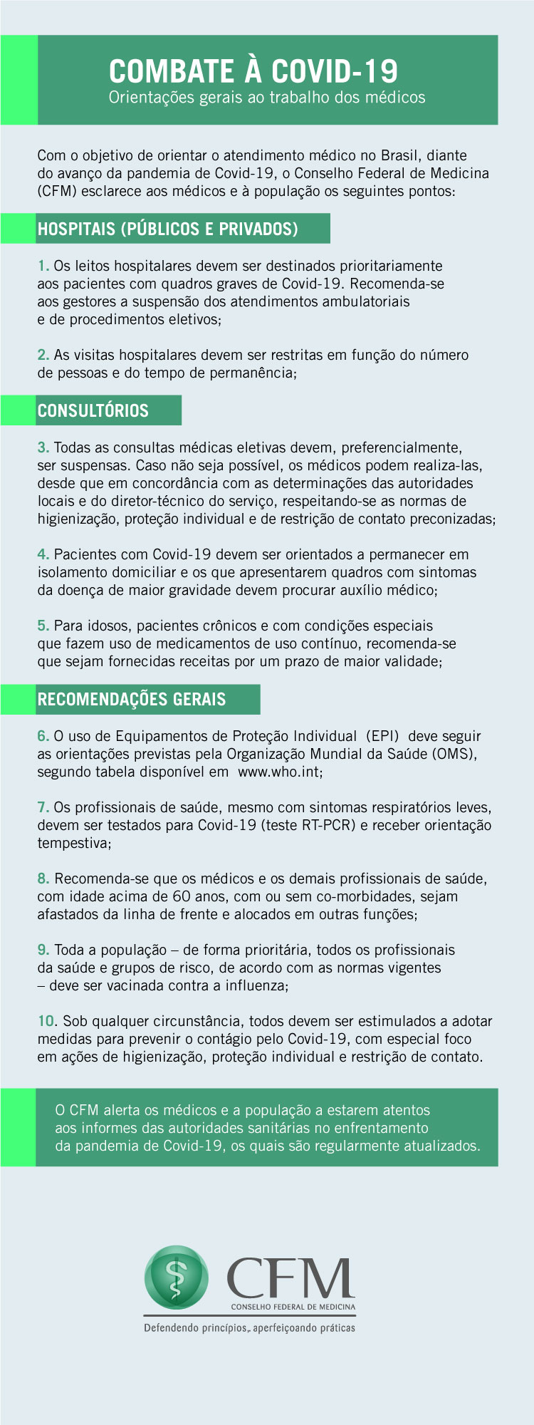 Com respeito ao funcionamento dos consultórios, o CFM afirma que todas as consultas médicas eletivas devem, preferencialmente, ser suspensas. No entanto, “caso não seja possível, os médicos podem realizá-las, desde que em concordância com as determinações das autoridades locais e do diretor-técnico do serviço, respeitando-se as normas de higienização, proteção individual e de restrição de contato preconizadas”, orienta.