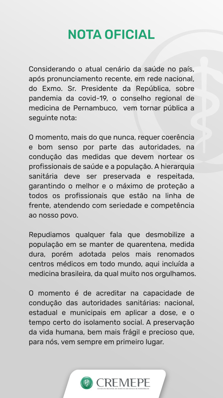 Considerando o atual cenário da saúde no país, após pronunciamento recente, em rede nacional, do Exmo. Sr. Presidente da República, sobre pandemia da covid-19, o Conselho Regional de Medicina de Pernambuco, vem tornar pública a seguinte nota: