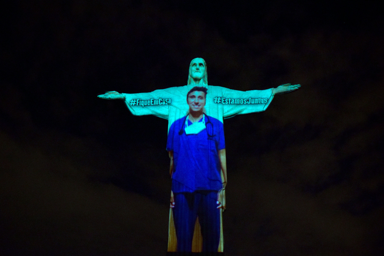 Foi para agradecer e homenagear médicos e os demais profissionais de saúde que estão atuando na linha de frente contra a Covid-19 que o Cristo Redentor ganhou nesse domingo de Páscoa uma iluminação especial, como se a estátua vestisse um jaleco com um estetoscópio pendurado nos ombros.