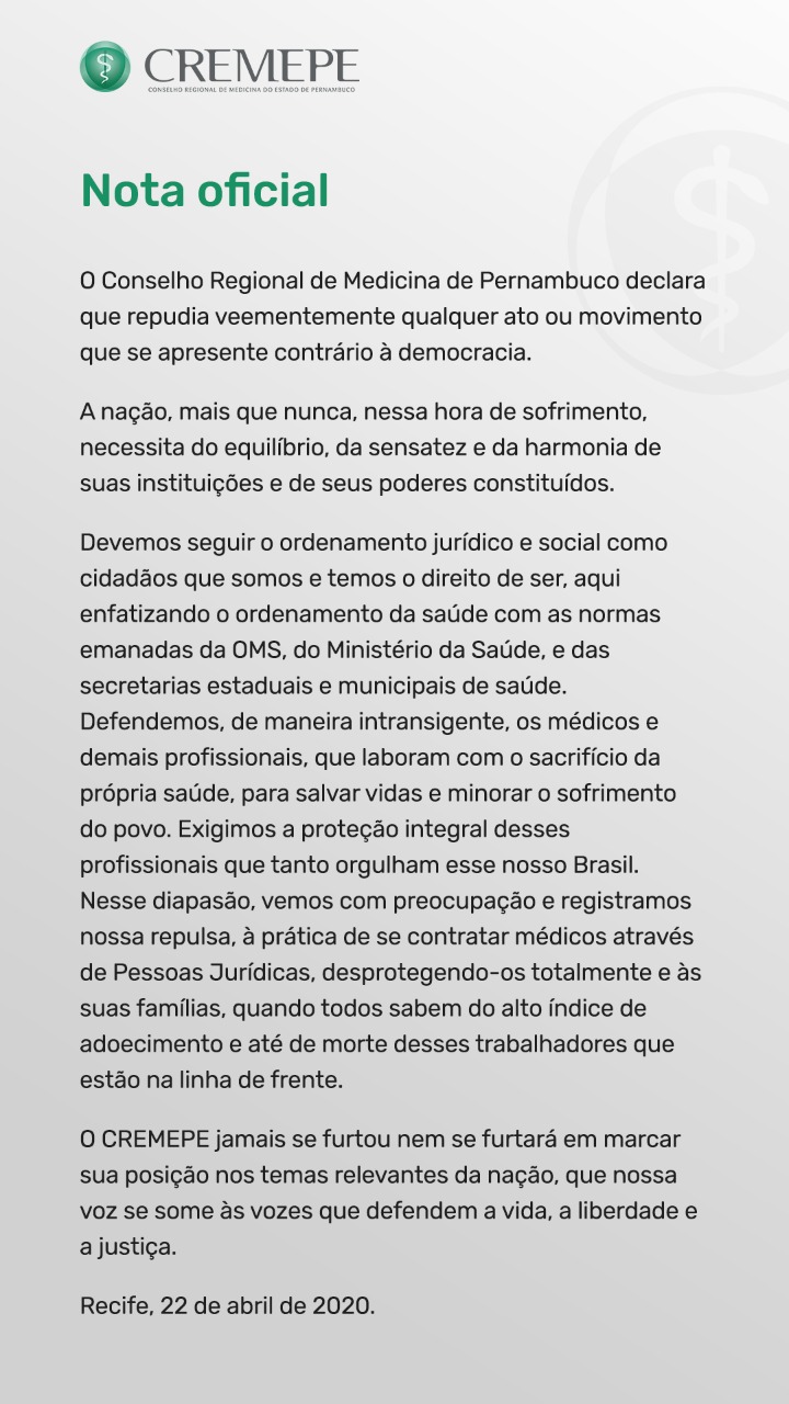 O Conselho Regional de Medicina de Pernambuco declara que repudia veementemente qualquer ato ou movimento que se apresente contrário à democracia.