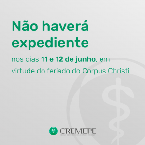 Em face do feriado de Corpus Christi, nesta quinta-feira (11/06), o presidente do Cremepe determinou que não haverá expediente na sede do Conselho e delegacias regionais na quinta e sexta-feira (12/06). Os atendimentos voltam ao horário especial durante a pandemia, das 9h às 15h, na segunda-feira, 15 de junho de 2020.