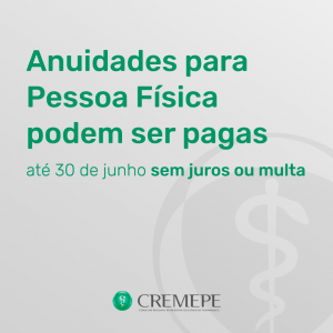 Em virtude da pandemia do novo Coronavírus (COVID-19), as anuidades referentes ao exercício de 2020 do Conselho Regional de Medicina de Pernambuco (Cremepe), para pessoa física, com vencimento previsto para 31 de março (terça-feira), podem ser pagas sem os acréscimos de multa e juros até o dia 30 de junho de 2020, excepcionalmente para aqueles médicos que entrarem em contato com o Cremepe – através do atendimento@cremepe.org.br.