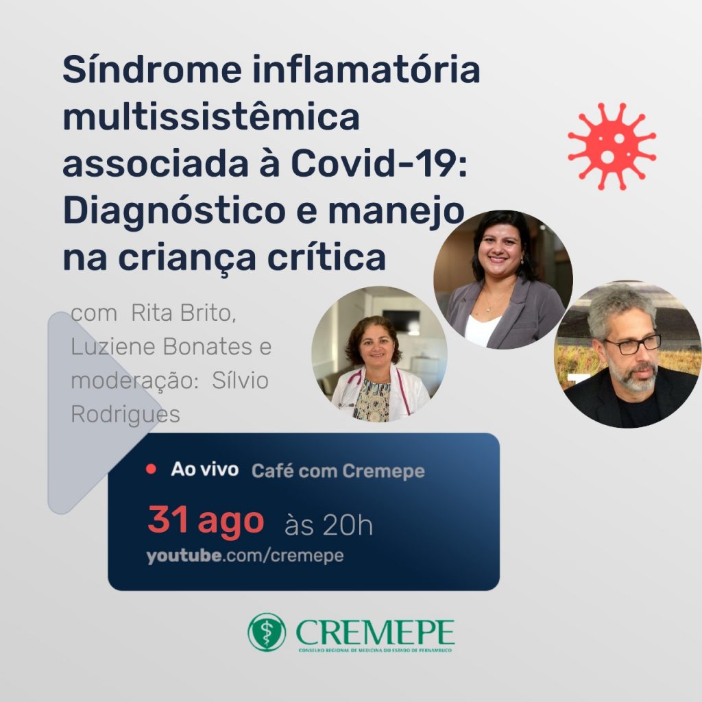 O Cremepe promove na segunda-feira (31/08), às 20h, a live sobre “Sindrome inflamatória multissistêmica associada a covid : diagnóstico e manejo na criança crítica” com as médicas Rita Brito e Luziene Bonates. A moderação é do conselheiro Sílvio Rodrigues.