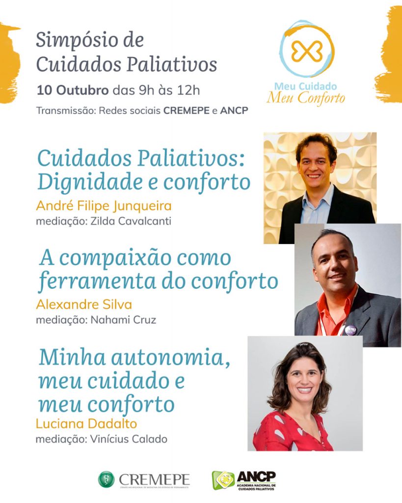 Em celebração ao Dia Mundial dos Cuidados Paliativos, que este ano tem em sua campanha o tema “Meu Cuidado, Meu Conforto”, a Câmara Temática de Cuidados Paliativos do Conselho Regional de Medicina de Pernambuco (CREMEPE) em parceria com a Academia Nacional de Cuidados Paliativos (ANCP) realizarão no dia 10 de outubro, “Simpósio on-line Meu Cuidado, Meu Conforto” com divulgação pelos canais das duas instituições na redes sociais. A transmissão terá início às 09h e contará com a participação de alguns dos mais renomados especialistas em Cuidados Paliativos de nosso país.