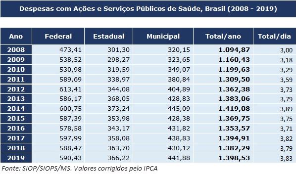 Segundo o apurado, em 2019, as despesas nos três níveis de gestão atingiram a cifra de R$ 292,5 bilhões. O montante agrega a cobertura das ações e serviços de aperfeiçoamento do Sistema Único de Saúde (SUS), como o custeio da rede de atendimento e pagamento de funcionários, dentre outras. Na avaliação do presidente da autarquia, Mauro Ribeiro, os indicadores de saúde e as más condições de trabalho no setor revelam que os valores gastos ainda estão abaixo do ideal.