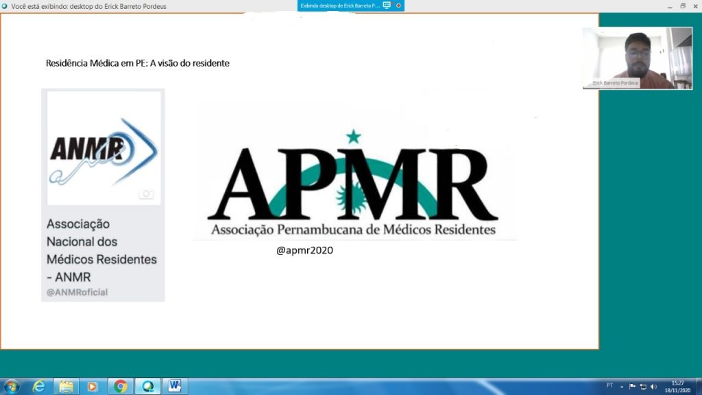 O presidente da Associação Pernambucana de Médicos Residentes (APMR), Erick Barreto Pordeus, apresentou a aula “Residência Médica em Pernambuco: a visão dos residentes”, através de plataforma on-line, no XI Curso Básico de Atualização em Ética e Bioética para Residência Médica do Cremepe, na tarde desta quarta-feira (18/11), encerrando o ciclo de palestras do evento. Após a aula do médico, foi aberta a sessão de análise e discussão de casos, mediada pelos conselheiros do Cremepe.