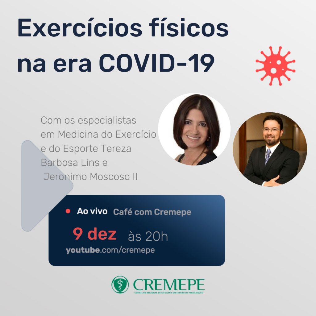No dia 9 de dezembro, às 20h, o Cremepe promoverá a live “Exercícios físicos na era COVID-19” com os os especialistas em Medicina do Exercício e do Esporte Tereza Barbosa Lins e Jerônimo Moscoso II. A live será transmitida através Youtube e Facebook d Cremepe.