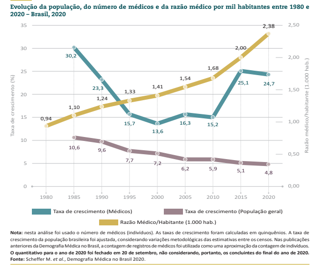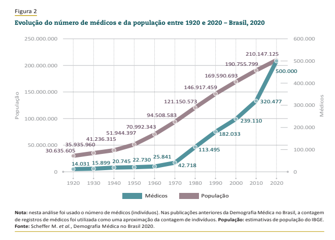 Até os anos 1970, o crescimento no número de médicos era proporcional ao da população, aumentando numa velocidade maior durante o regime militar e subindo de forma acelerada desde 2010 (ver gráfico abaixo). Nos últimos 50 anos, o número de médicos cresceu quase quatro vezes mais que o da população. Em 1970, o país tinha 42.718 médicos e uma população de 94,5 milhões de pessoas. Em 2020, são mais de 500 mil médicos para 210 milhões de brasileiros. No período, o número de médicos aumentou 11,7 vezes, enquanto a população subiu 2,2 vezes.