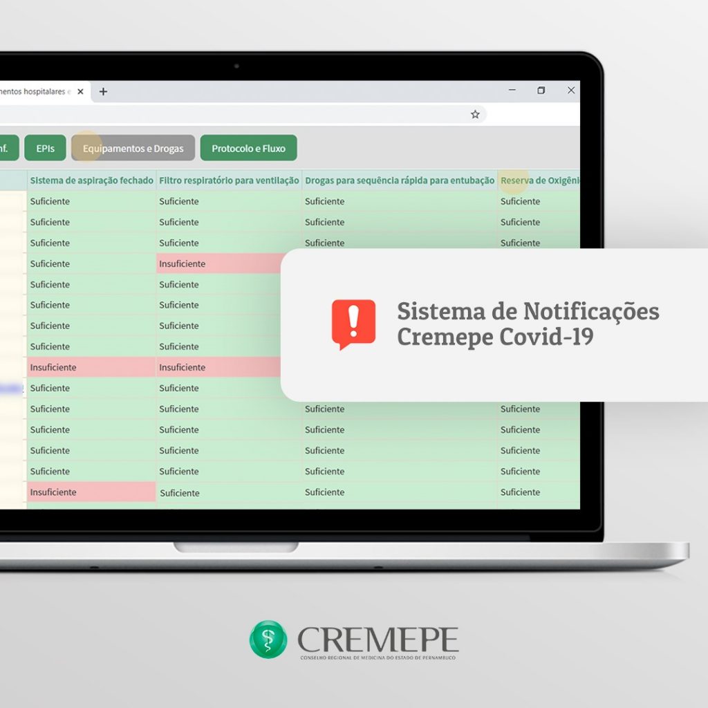 O Cremepe através de informações das direções técnicas no Sistema de Notificações Cremepe COVID-19 (Resolução Nº 03/2020) acompanha, diariamente, a situação das unidades de atendimento COVID-19 no Estado. O Sistema já tem mais de 100 unidades cadastradas que incluem dados referentes aos Equipamentos de Proteção Individual, fluxos de atendimento, medicamentos e leitos. Quando identificado déficit, o Cremepe notifica a gestão para apresentar de forma imediata medidas adotadas para correção.