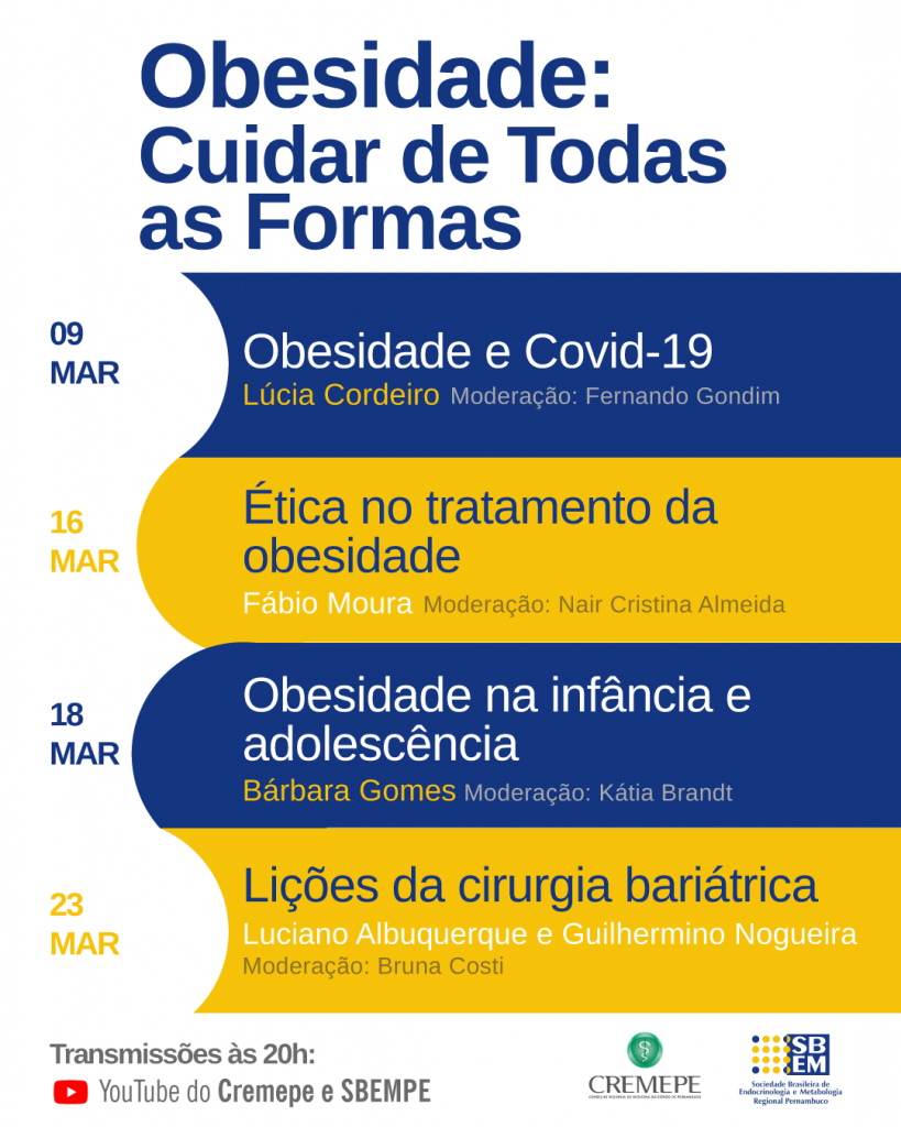 O Cremepe em parceria com a Sociedade Brasileira de Endocrinologia e Metabologia de Pernambuco (Sbempe) promove, neste mês de março, lives sobre obesidade. Este ano a campanha “Cuidar de todas as formas” lembra que pessoas com obesidade frequentemente se sentem envergonhadas e culpadas por não entenderem que se trata de uma doença, e como tal, precisa ser tratada. Portanto, temas como “obesidade e covid-19”, “ética no tratamento da obesidade”, “obesidade na infância e adolescência” e “lições da cirurgia bariátrica” serão discutidos em quatro encontros virtuais transmitidos pelas redes sociais do Cremepe e SBEMPE.