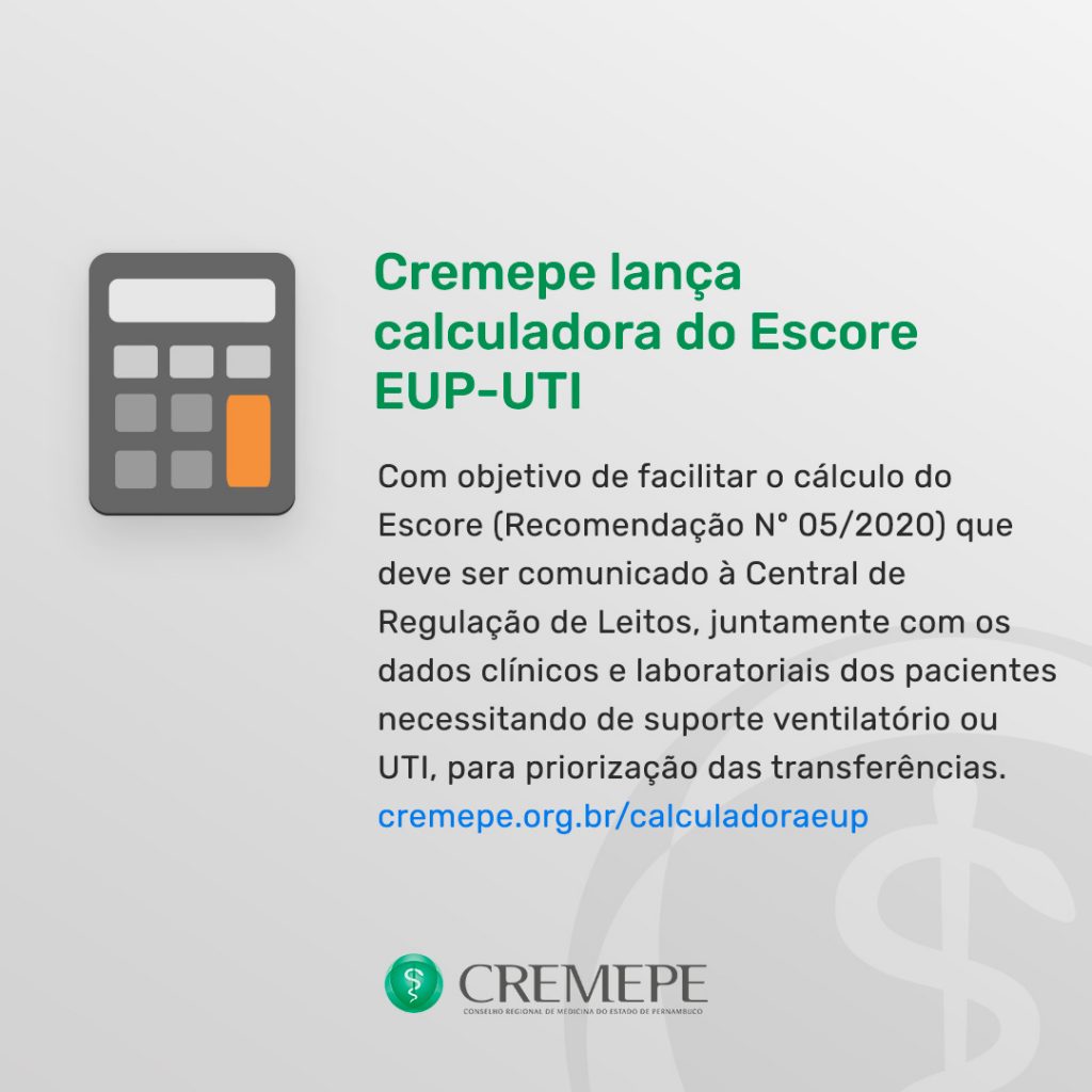 A calculadora tem o objetivo de facilitar o cálculo do Escore (Recomendação Cremepe Nº 05/2020) que deve ser comunicado à Central de Regulação de Leitos, juntamente com os dados clínicos e laboratoriais dos pacientes necessitando de suporte ventilatório ou UTI, para priorização das transferências.