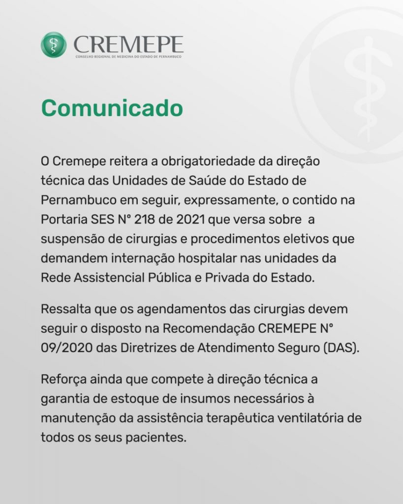 O Cremepe reitera a obrigatoriedade da direção técnica das Unidades de Saúde do Estado de Pernambuco em seguir, expressamente, o contido na Portaria SES Nº 218 de 2021 que versa sobre a suspensão de cirurgias e procedimentos eletivos que demandem internação hospitalar nas unidades da Rede Assistencial Pública e Privada do Estado.