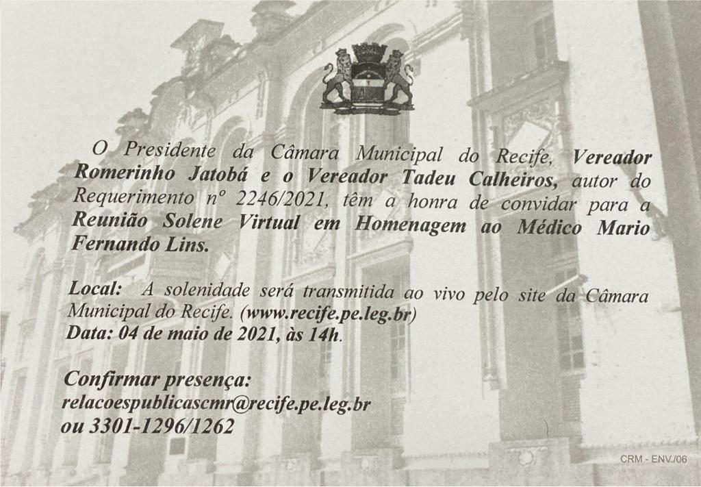 O 2º secretário e ex-presidente do Conselho Regional de Medicina de Pernambuco (Cremepe), Mario Fernando Lins, será homenageado na próxima terça-feira (04/05) pela Câmara Municipal do Recife por sua história de contribuição à medicina pernambucana. Todos estão convidados a prestigiar a solenidade, que será realizada de forma virtual e transmitida ao vivo pelo site da Câmara Municipal do Recife (www.recife.pe.leg.br), a partir das 14h.