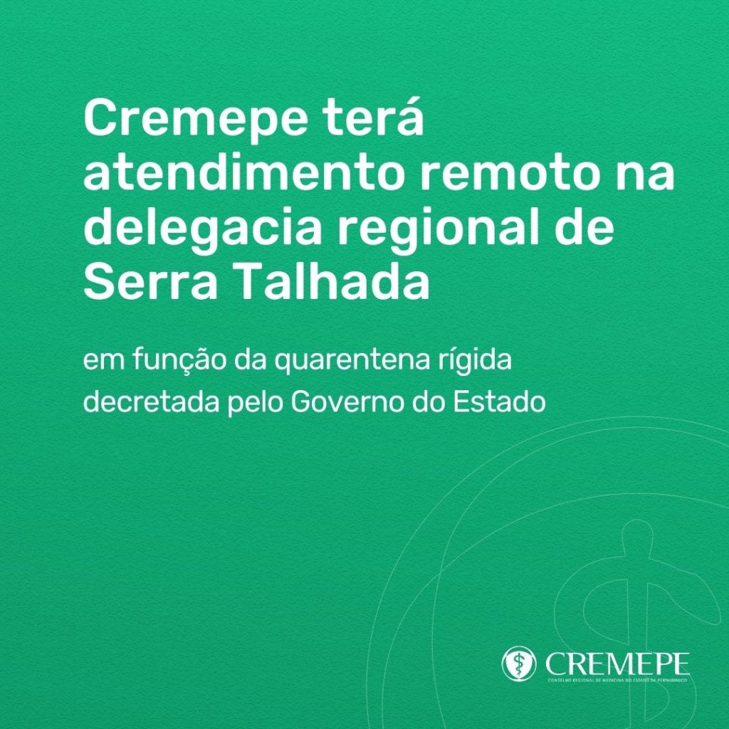 Devido às medidas mais rígidas decretadas pelo Governo de Pernambuco no sertão do estado, em decorrência do aumento nas solicitações por leitos de UTI nas últimas duas semanas, a delegacia regional de Serra Talhada do Conselho Regional de Medicina de Pernambuco (Cremepe) terá atendimento de forma remota, através do número (87) 98157-5886, durante o período de maiores restrições na região.