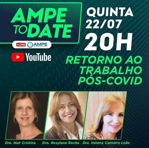 A Associação Médica de Pernambuco (Ampe) promove nesta quinta-feira (22/07) mais uma edição do AMPE TO DATE com o tema “Retorno ao trabalho pós-covid” através do YouTube da Associação. Esta edição contará com a participação da conselheira por Pernambuco, Helena Carneiro Leão, a moderação da médica Nair Cristina que entrevistará a presidente da Associação Nacional de Medicina do Trabalho Rolysane Rocha que também é especialista em Medicina do Trabalho, Medicina Legal e Perícias Médicas.