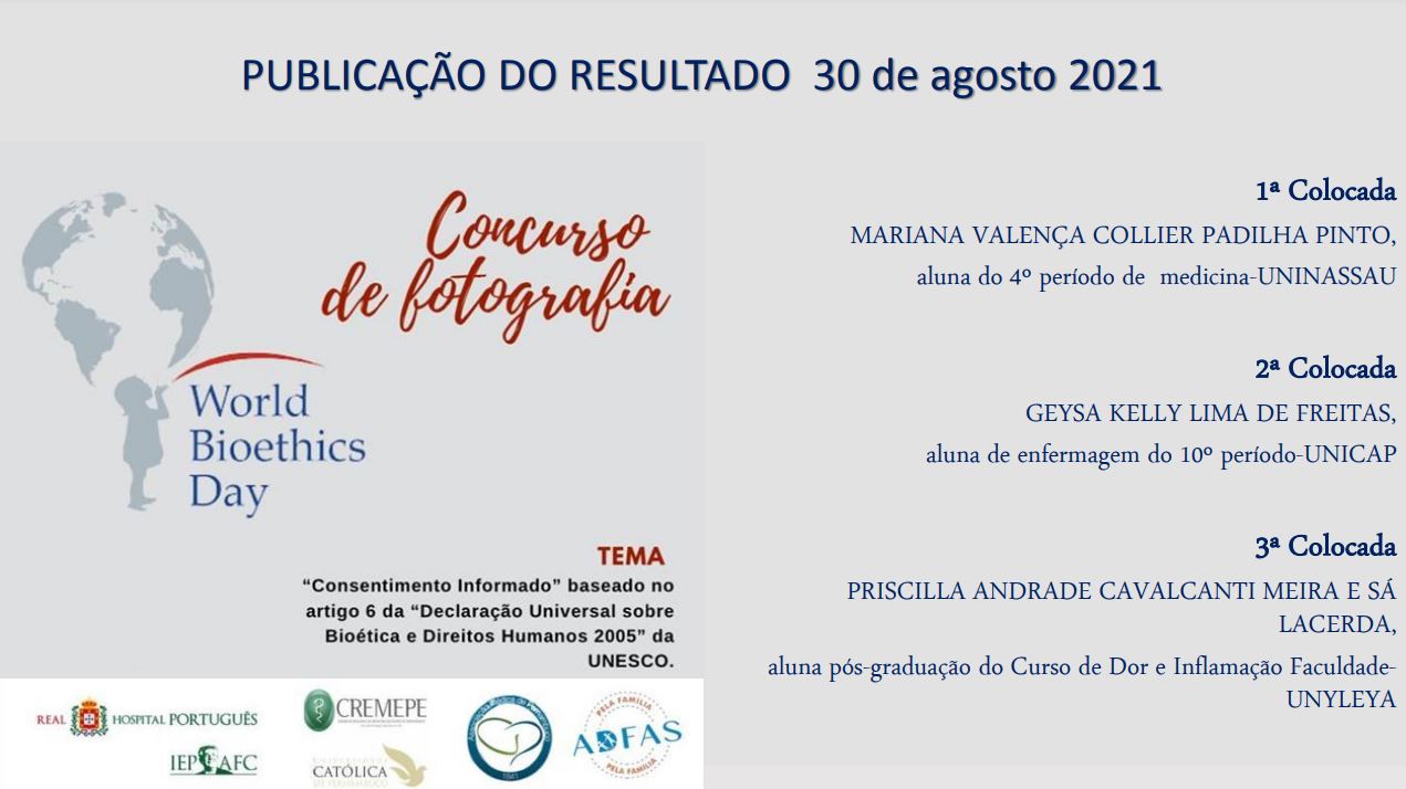 O Instituto de Ensino e Pesquisa Alberto Ferreira da Costa (IEPAFC), com o apoio do Cremepe, divulgou nesta segunda-feira (30/09) o resultado do concurso de fotografia “World Bioethics Day”, da Unidade de Bioética Real Hospital Português – Member of International Chair in Bioethics (WMA). O tema do concurso foi “Consentimento Informado”, baseado no Art. 6 da “Declaração Universal sobre Bioética e Direitos Humanos 2005” da UNESCO. O concurso é voltado para estudantes de graduação e pós-graduação das Ciências da Saúde de Pernambuco.