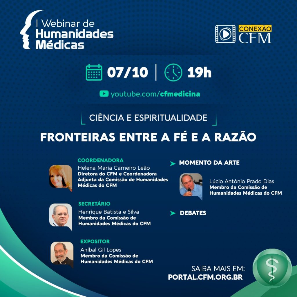Com o tema central “Ciência e espiritualidade”, a palestra on-line propõe levantar debate sobre as fronteiras entre a fé e a razão. Para tratar do assunto, o convidado será o professor de fisiologia, médico e padre, Aníbal Gil Lopes. O encontro será mediado pelos membros da Comissão de Humanidades Médicas do CFM, Helena Carneiro Leão e Henrique Batista. Ainda está previsto na programação do Webinar um momento da arte com a apresentação, pelo membro da Comissão, Lúcio Antônio Prado Dias, da Orquestra Juvenil da Bahia.