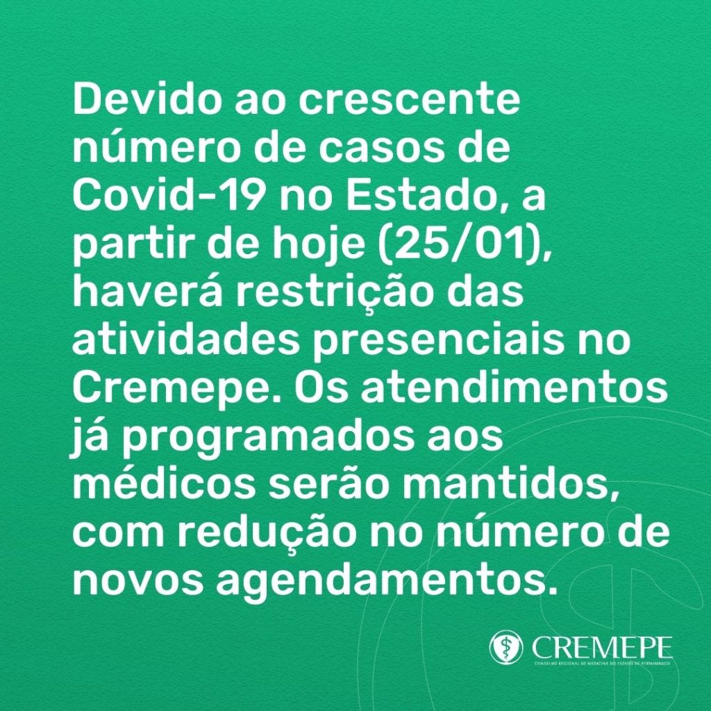 Diante do aumento no número de casos da variante Ômicron no Estado, o Conselho Regional de Medicina de Pernambuco (Cremepe) informa que haverá restrição das atividades presenciais e redução no número de novos atendimentos na sede e delegacias regionais da autarquia (Petrolina, Caruaru, Araripina e Serra Talhada) durante o período de 15 dias.