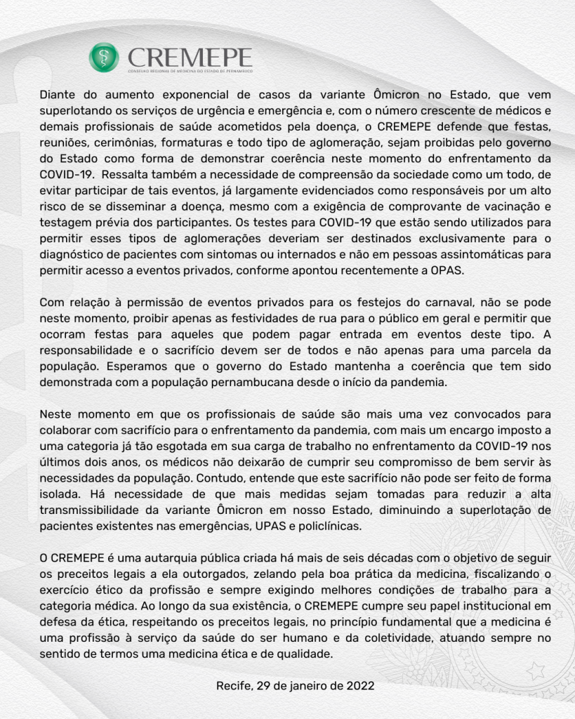 Diante do aumento exponencial de casos da variante Ômicron no Estado, que vem superlotando os serviços de urgência e emergência e, com o número crescente de médicos e demais profissionais de saúde acometidos pela doença, o CREMEPE defende que festas, reuniões, cerimônias, formaturas e todo tipo de aglomeração, sejam proibidas pelo governo do Estado como forma de demonstrar coerência neste momento do enfrentamento da COVID-19. Ressalta também a necessidade de compreensão da sociedade como um todo, de evitar participar de tais eventos, já largamente evidenciados como responsáveis por um alto risco de se disseminar a doença, mesmo com a exigência de comprovante de vacinação e testagem prévia dos participantes. Os testes para COVID-19 que estão sendo utilizados para permitir esses tipos de aglomerações deveriam ser destinados exclusivamente para o diagnóstico de pacientes com sintomas ou internados e não em pessoas assintomáticas para permitir acesso a eventos privados, conforme apontou recentemente a OPAS.