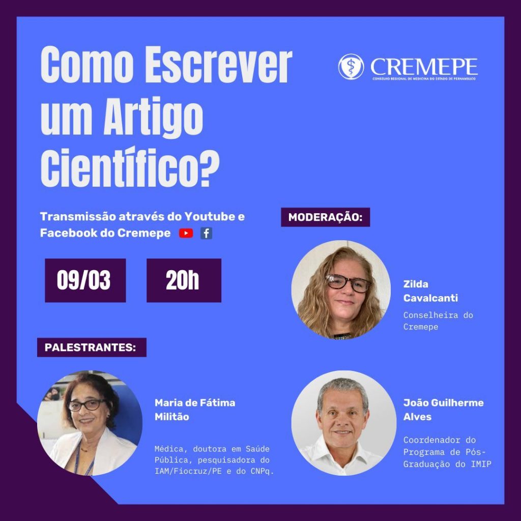No próximo dia 9 de março, o Cremepe promoverá a live sobre “Como escrever artigo científico?”, às 20h, através do Youtube e Facebook da entidade. Na oportunidade, a médica Fátima Militão, pesquisadora do IAM/Fiocruz/PE e do CNPq, doutora em Saúde Pública pela Escola Nacional de Saúde Pública/Fiocruz apresentará a aula. Já a moderação será da secretária-geral do Cremepe, Zilda Cavalcanti, e o conselheiro e coordenador da pós-graduação do IMIP, João Guilherme Alves, debaretá o tema.
