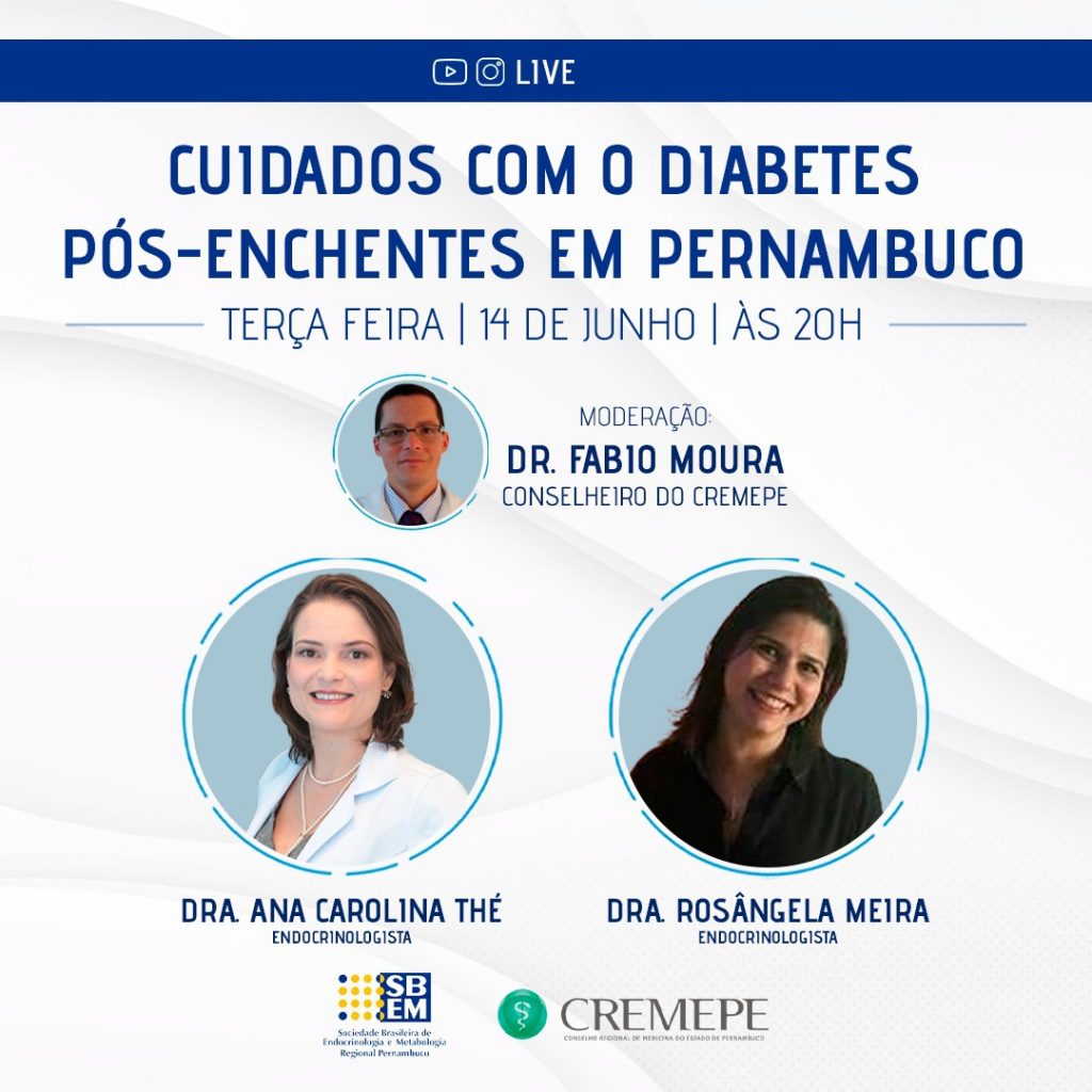 O Conselho Regional de Medicina de Pernambuco (Cremepe) realizará, em parceria com a Sociedade Brasileira de Endocrinologia e Metabologia Regional Pernambuco (SBEM-PE), na próxima terça-feira (14/06), às 20h, uma live sobre os “Cuidados com o diabetes pós-enchentes em Pernambuco”. A transmissão ao vivo será feita através das redes sociais das entidades. A live contará com as apresentações das endocrinologistas Ana Carolina Thé e Rosângela Meira e a moderação do, também endocrinologista, e conselheiro do Cremepe, Fábio Moura.