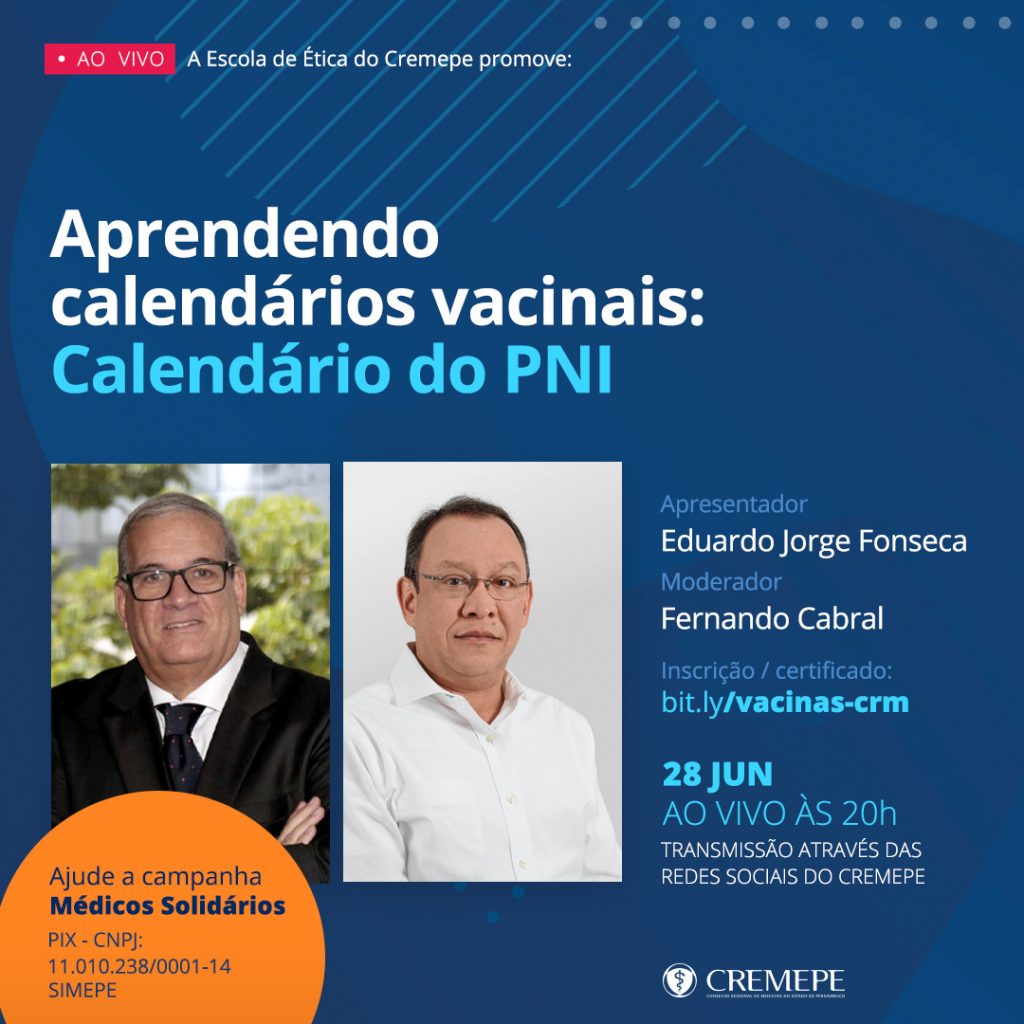 Na próxima terça-feira, dia 28 de junho, às 20h, o Conselho Regional de Medicina de Pernambuco (Cremepe) irá transmitir uma live sobre o Calendário do Programa Nacional de Imunizações (PNI). A apresentação será feita pelo conselheiro da autarquia, Eduardo Jorge Fonseca, e terá a moderação do Coordenador da Escola Superior de Ética Médica (ESEM), Fernando Cabral.