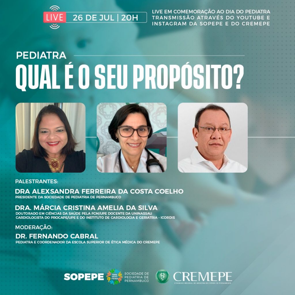 Na próxima terça-feira (26/07), às 20h, o Cremepe e a Sociedade de Pediatria de Pernambuco promoverão uma live em comemoração do Dia do Pediatra (27 de julho), o encontro online será sobre o propósito da pediatria. A live terá apresentação da presidente da Sopepe, Alexsandra Costa, e da cardiologista Márcia Cristina Amelia da Silva. A moderação será do pediatra e coordenador da Escola Superior de Ética Médica do Cremeoe, Fernando Cabral. A transmissão será pelo Instagram e Youtube das duas entidades.